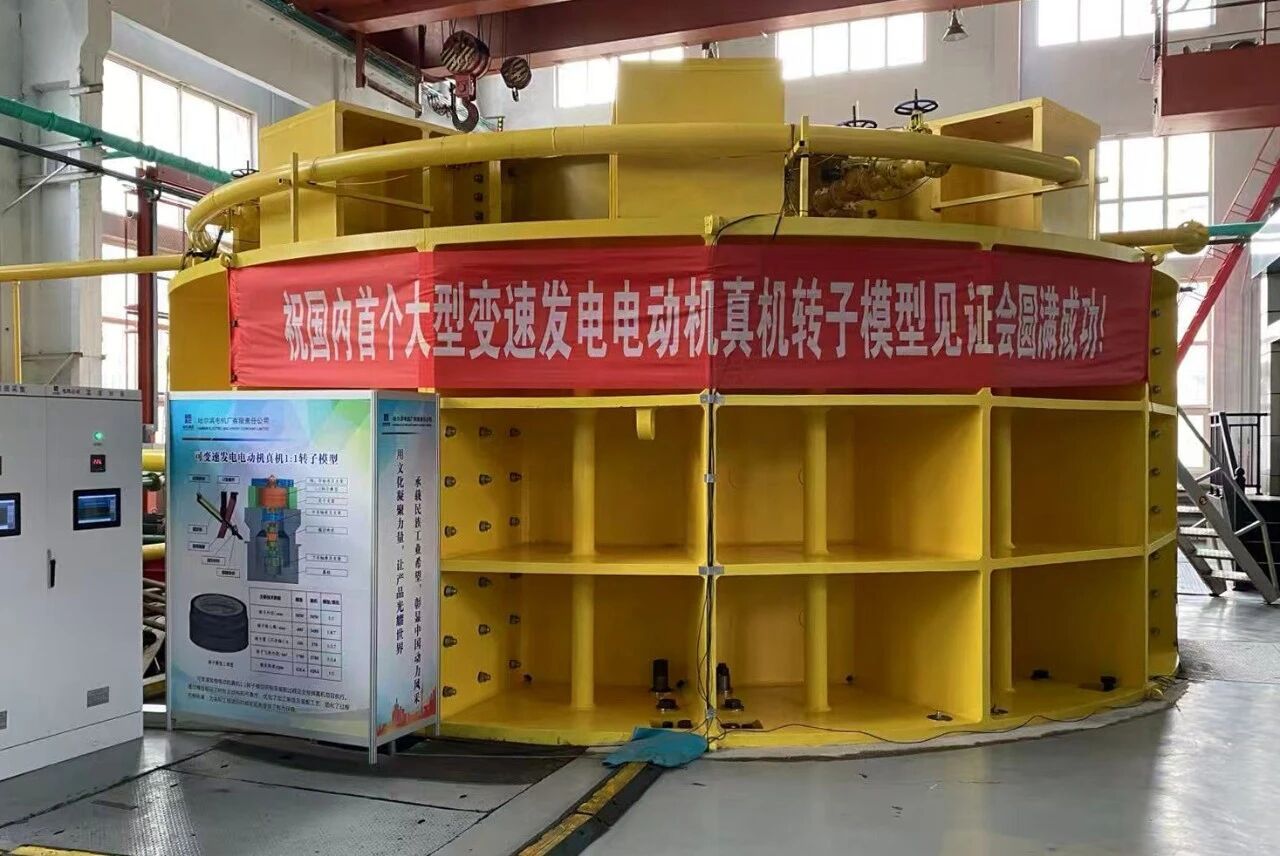 回望哈電集團變速抽水蓄能機組的研發之路,是幾代人勇闖“無人區”的堅守與圓夢的歷程。從20世紀90年代開啟交流勵磁電機理論研究與模型驗證,到2016年完成豐寧二期項目模擬設計及轉子模型研制;從2021年依托國家重點研發計劃,成功研制10兆瓦變速海水蓄能發電電動機樣機并完成帶負載并網聯調試驗,再到當前,國內首次完成直徑5米級立式1:1真機轉子模型試驗,世界電壓/電流等級最高、難度最大的6.6千伏/萬安培級1:1集電系統模型試驗,國內首次提出的U/T型螺栓組合式端部固定結構的Bypass旁路通風模型試驗等,分別通過行業專家見證和驗收。研發團隊突破了一個個關鍵核心技術瓶頸,每一步都凝聚著哈電人的心血與汗水,每一次突破都彰顯著大國工匠的執著與堅守,每一項成果都鐫刻著自主創新的堅定與豪邁。