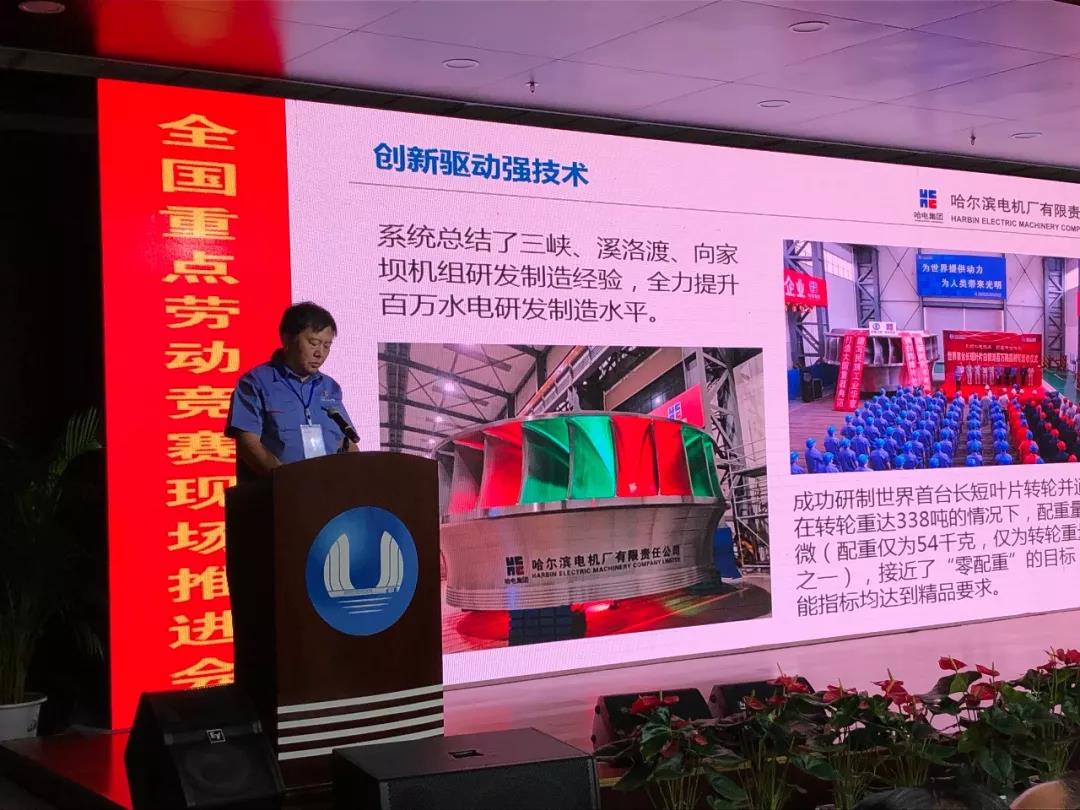 會議組織了金沙江流域水電工程現場觀摩,分別參觀了白鶴灘水電站文體中心的勞動競賽展板展示、左岸834平臺、右岸場地安裝間以及哈電集團電機公司轉輪加工廠等,向各重點競賽組委會頒授了任務書。哈電集團有關人員介紹了參與勞動競賽情況,并在推進會上作了題為“深化金沙江勞動競賽助力白鶴灘精品工程”的典型發言,其他競賽組委會分別以現場交流和書面交流的方式介紹了經驗做法。